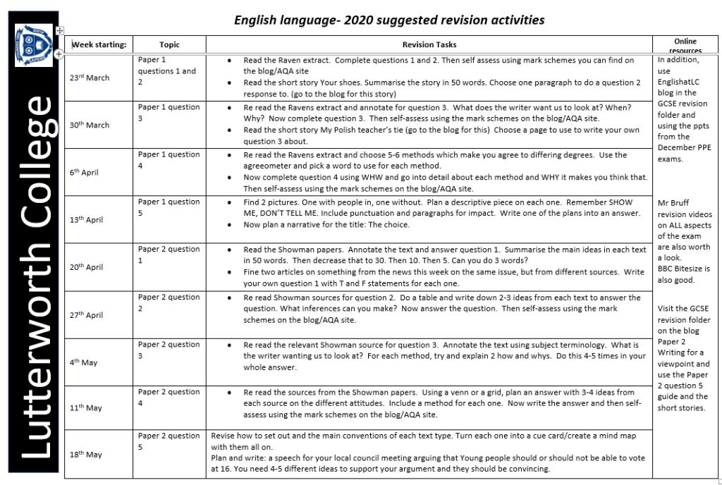 I have been busy putting together revision resources for year 11 to aid their independent study. I have created a timetable for each week up to the examinations. There is a separate timetable for Language and one for literature. The resources are also included and include a full paper 1 and paper 2 for English language which you have not used before. Happy revising!