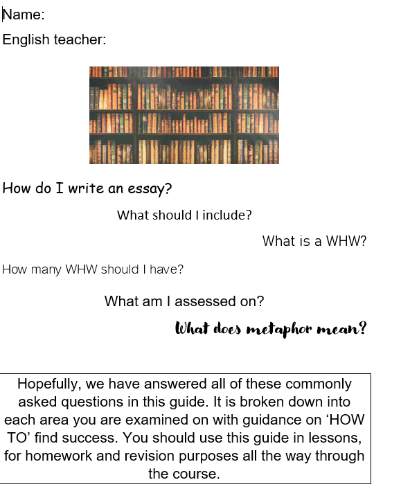 This handy guide has been put together to support year 10 and 11 in their GCSE Literature essays. It takes them step by step through what to do for each question, how to structure their response and what to look for in the text. The mark schemes are also there too.
