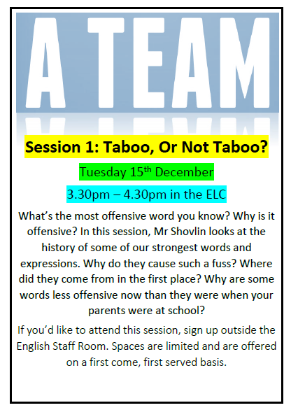 The next A Team session details are below… You’ll be able to sign up outside the English staff room from 3rd March. Places, as always, are first come first served.