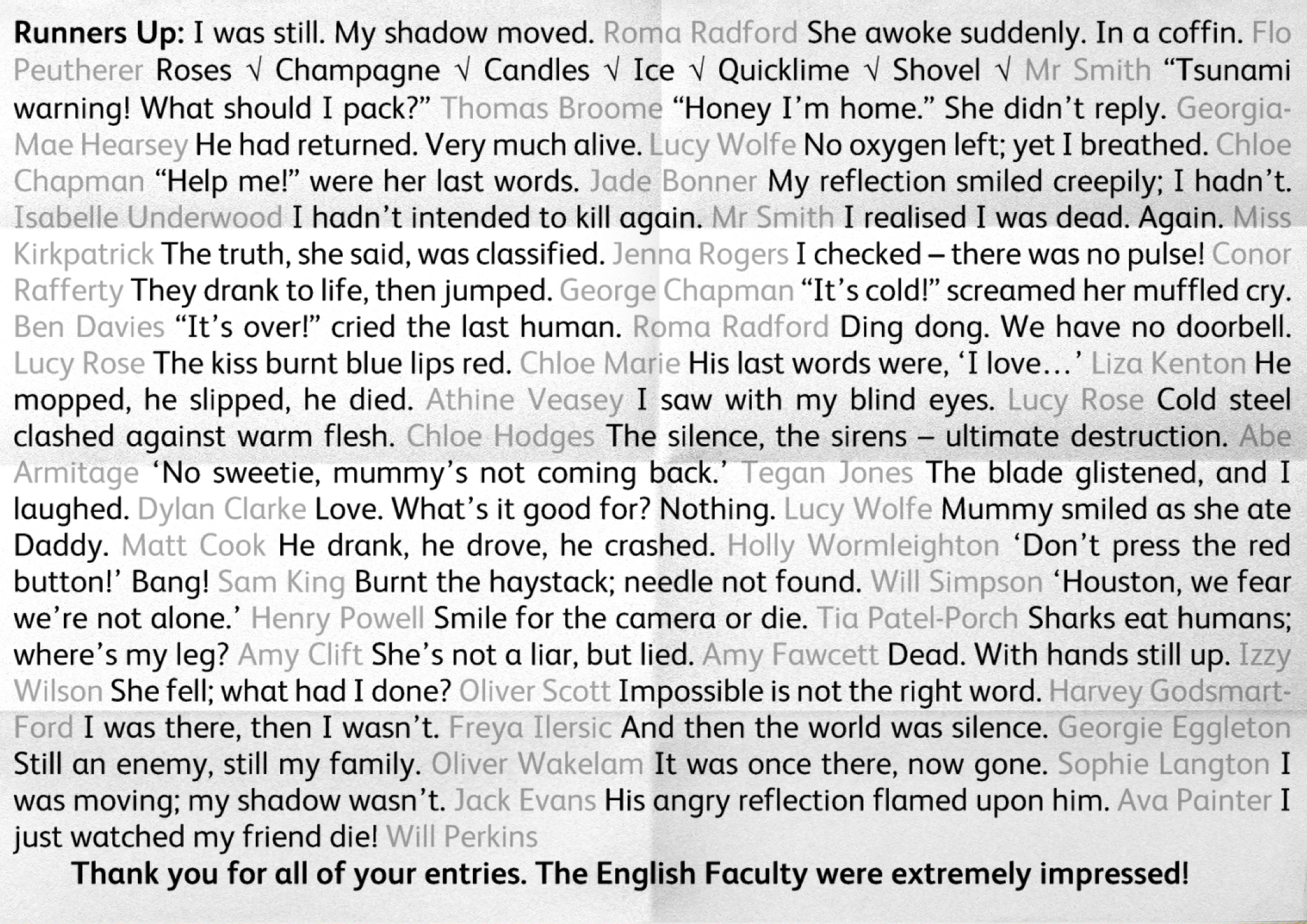 To enter the competition, post your story as a comment on this post, along with your name and English teacher, or tweet us your entry (@englishatlc), or hand your story in on paper to your English teacher directly.