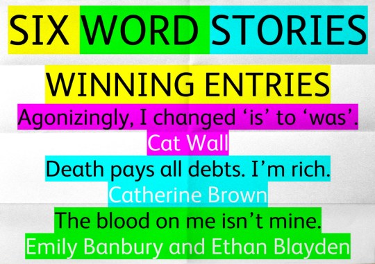 Thanks to all of you who entered our Six Word Story competition; we received more than 100 entries in total, and were incredibly impressed by the quality of the writing.